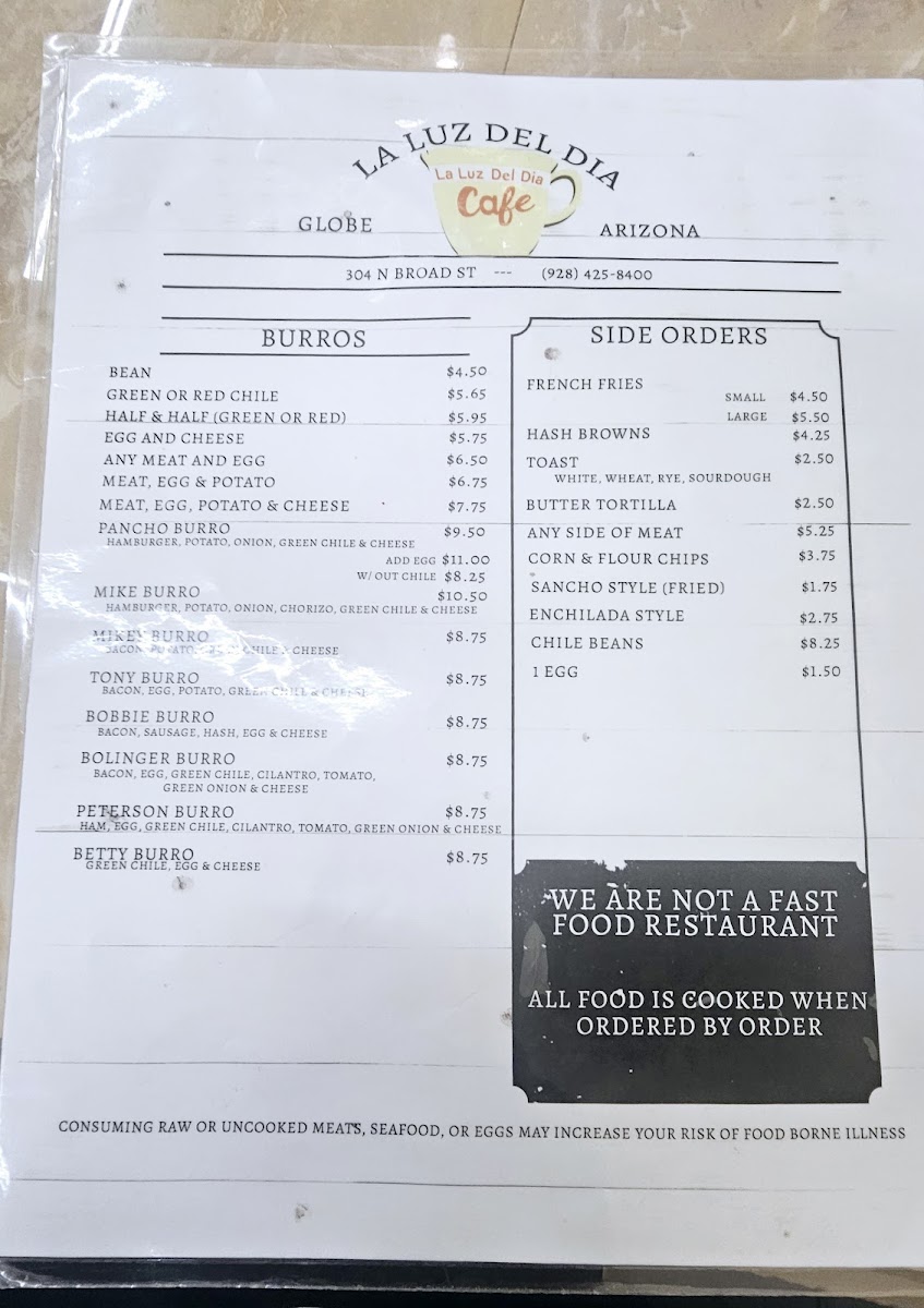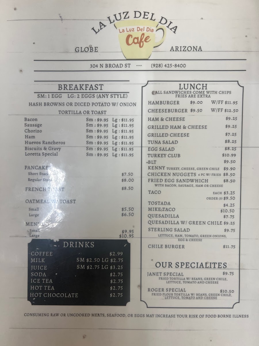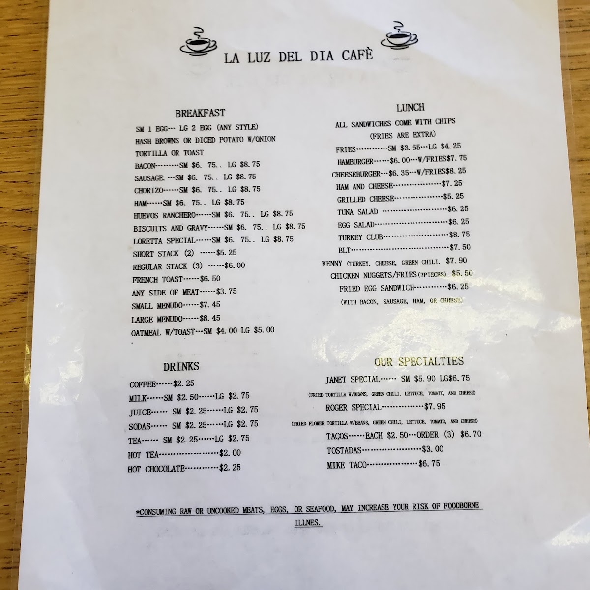 Welcome to La Luz Del Dia, a hidden gem nestled on North Broad Street in Globe, AZ. This charming little diner is known for its captivating breakfast and lunch offerings. Despite its modest size, patrons rave about the warm atmosphere and friendly staff who make you feel right at home.
